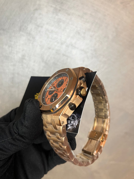 AUDEMARS PIGUET ROYAL OAK OFFSHORE CHRONO CASSA E BRACCIALE ORO QUADRANTE ARANCIONE